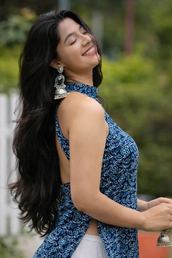 This stylish kurti features a trendy halter neckline that adds a contemporary touch to traditional ethnic wear. The elegant floral print enhances its feminine appeal, while the sleeveless design makes it perfect for warm weather, travel, and everyday styling.