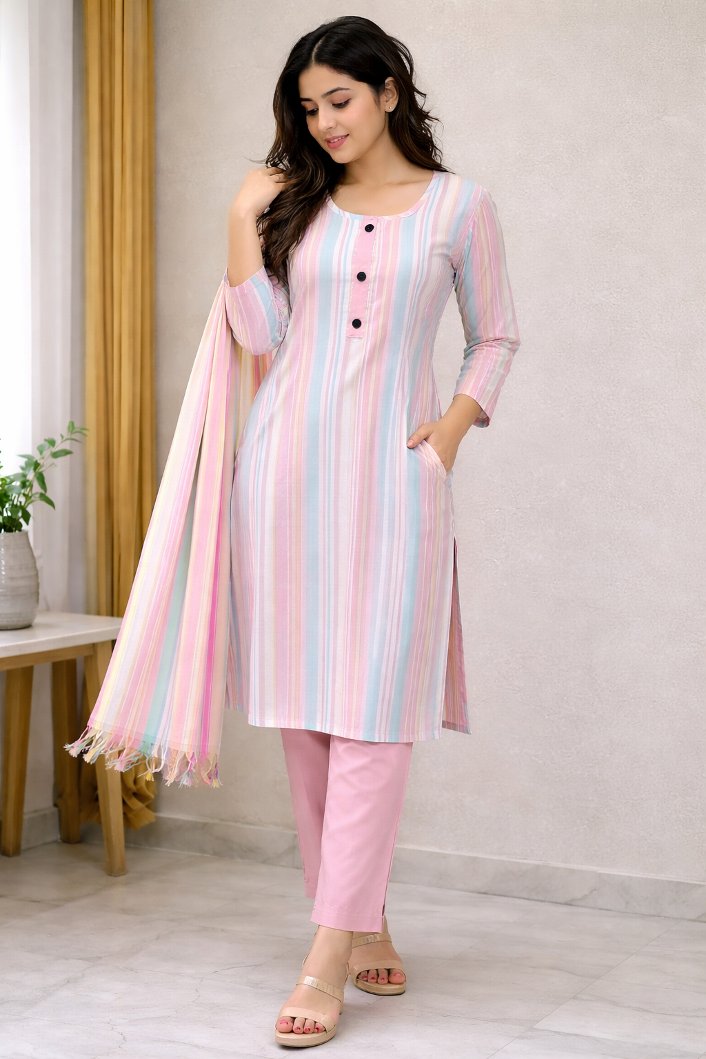 Crafted from soft breathable cotton, this kurti features a beautiful pastel stripe pattern with a comfortable straight fit and round neck design. The knee-length kurta is paired with matching cotton pants and a lightweight dupatta, making it perfect for daily wear, office wear, or casual outings.